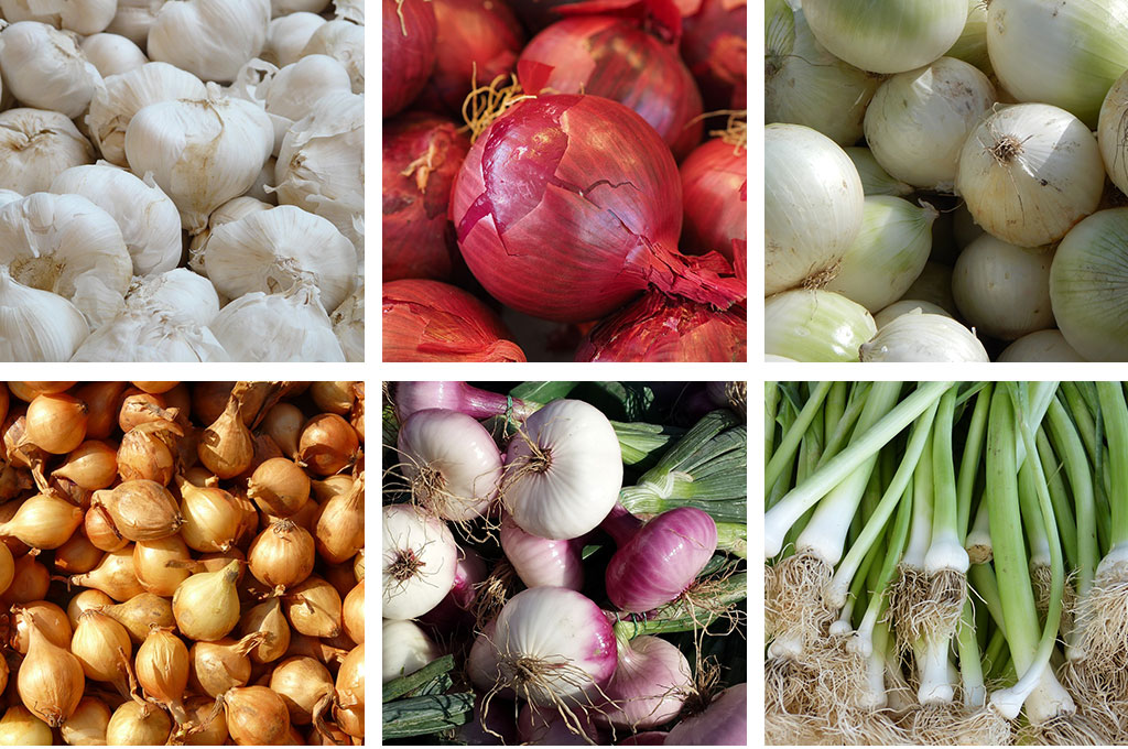 Clockwise: garlic, red onion, white onion, leeks, red shallots and shallots.