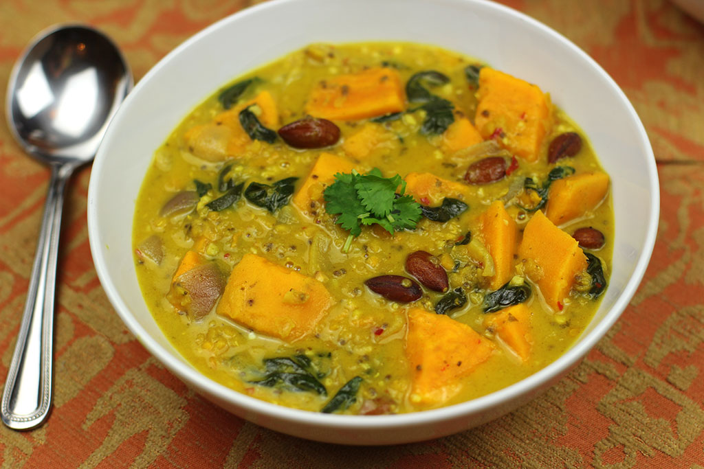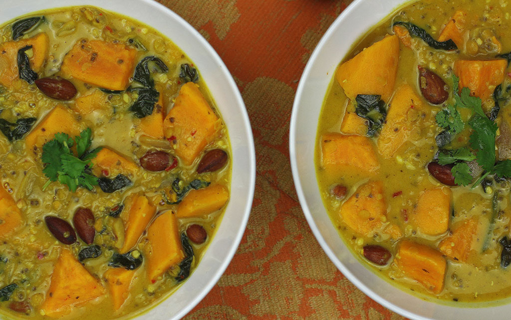 - Add the lentils, sweet potato, coconut milk and water and simmer for around 30 minutes until the lentils have absorbed all the water and the sweet potato is soft.